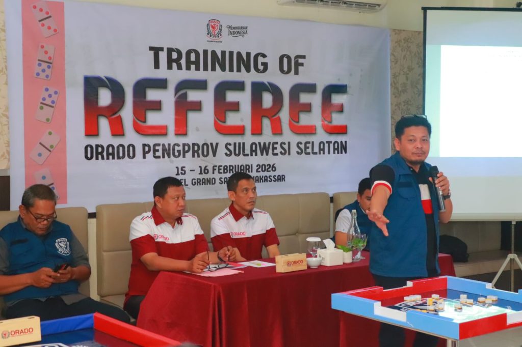 ruminews.id – MAKASSAR — Organisasi Olahraga Domino Indonesia (ORADO) Provinsi Sulawesi Selatan sukses menggelar kegiatan Pelatihan Sertifikasi dan Lisensi Wasit pada 15–16 Februari 2026 di Hotel Grand Sayang Makassar, Kota Makassar. Kegiatan ini diikuti oleh perwakilan pengurus kabupaten dan kota se-Sulawesi Selatan, serta menghadirkan pemateri langsung dari Pengurus Besar ORADO pusat.