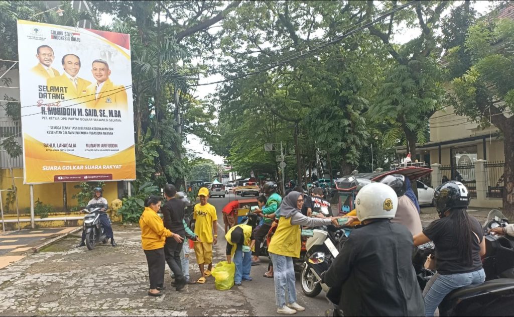 Sejak sore hari, para kader berbaju kuning khas partai berlambang pohon beringin itu telah bersiaga di tepi jalan. Di tengah padatnya arus lalu lintas menjelang waktu berbuka, mereka dengan sigap menyodorkan paket makanan kepada pengendara ojek online, sopir angkutan umum, hingga pejalan kaki yang melintas.