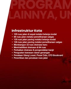 Satu tahun perjalanan ini menjadi fase pembuktian bahwa pembangunan dapat bergerak maju secara terukur dan merata. Di sektor infrastruktur, berbagai pembenahan dan pembangunan fasilitas publik menghadirkan wajah kota yang semakin tertata, konektivitas yang lebih baik, serta pelayanan dasar yang makin mudah diakses.
