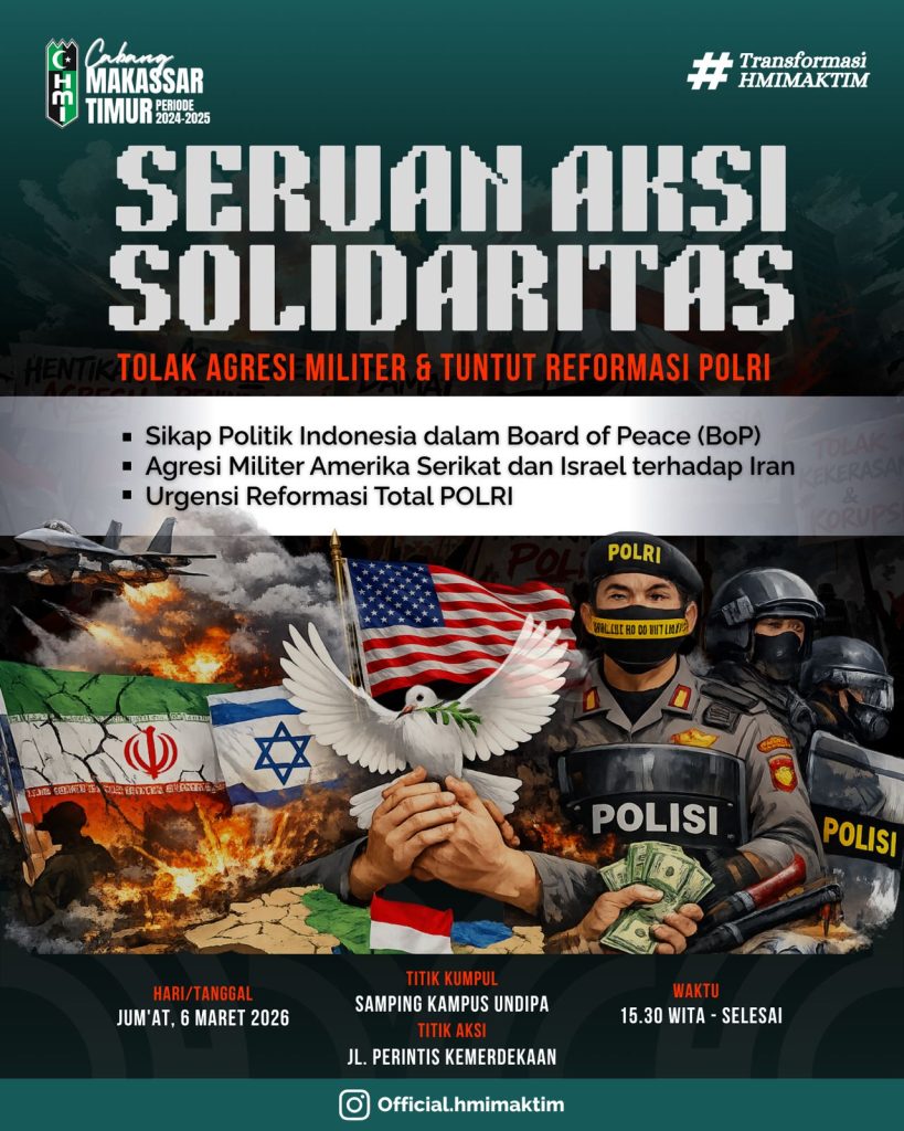 ruminews.id, Makassar — HMI Cabang Makassar Timur akan menggelar unjuk rasa di kawasan, Jalan Perintis Kemerdekaan, pada Jumat (6/3/2026) pukul 15.30 WITA hingga selesai.