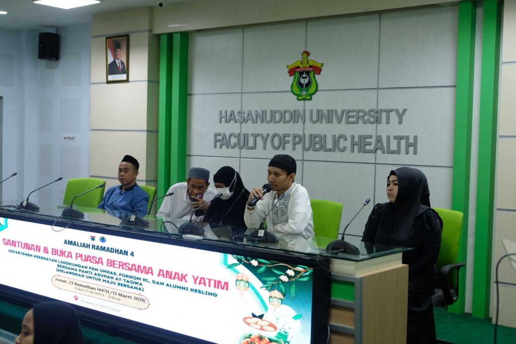 ruminews.id – Makassar, 13 Maret 2026 – Departemen Kesehatan Lingkungan Fakultas Kesehatan Masyarakat Universitas Hasanuddin (FKM UNHAS) melaksanakan kegiatan sosial bertajuk Amaliah Ramadhan 4 berupa santunan dan buka puasa bersama anak yatim. Kegiatan ini diselenggarakan di Ruang K225 Prof. Dr. H. Nur Nasry Noor, MPH, FKM UNHAS sebagai bagian dari rangkaian program Ramadhan yang mengusung semangat kepedulian, kebersamaan, dan penguatan nilai-nilai sosial keagamaan. Dalam kegiatan tersebut, anak-anak yatim dari Panti Asuhan At-Taqwa turut diundang untuk bersama-sama merasakan kebahagiaan di bulan suci Ramadhan.